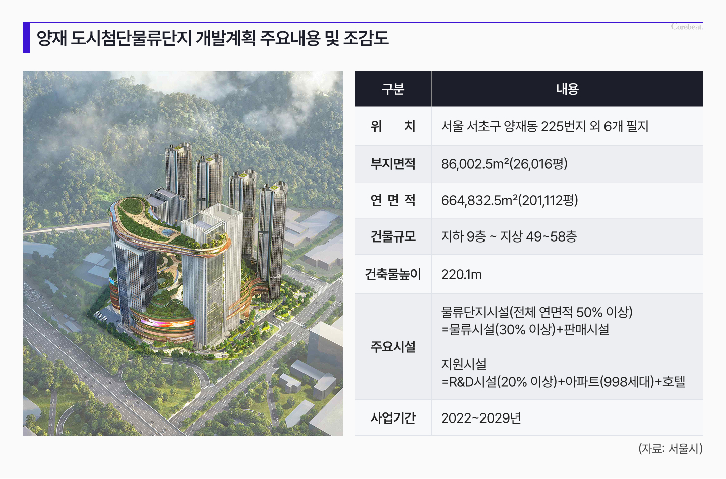 양재 도시 첨단 물류단지 개발사업은 서초구 양재동 225번지 일대 8만6000여㎡(약 2만6000여 평)에 조성된다. 규모는 지하 8층~지상 최고 58층, 연면적 약 66만4800여㎡(지하층 제외·약 20만1100여 평)로, 초대형 복합단지다.