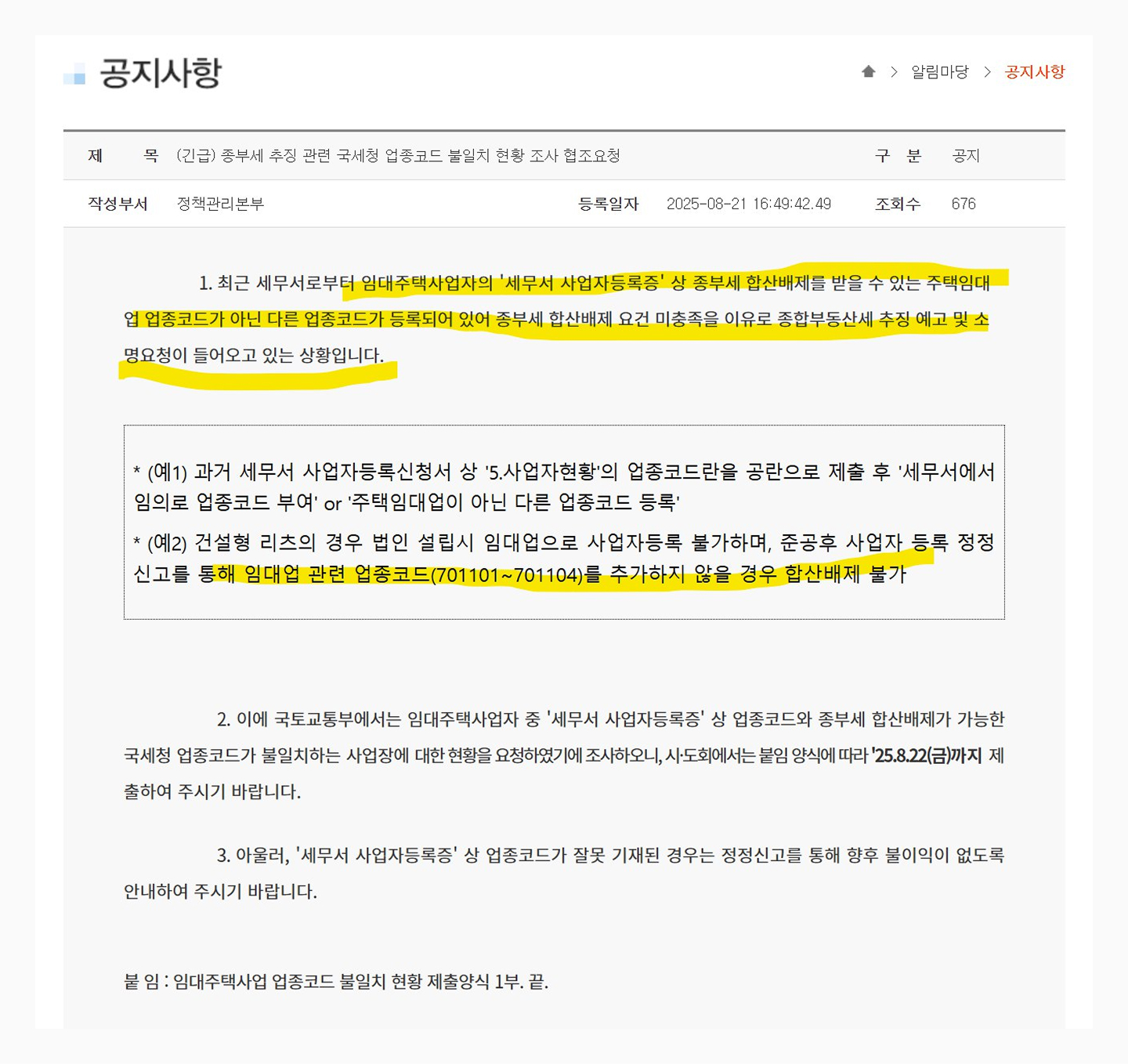 임대주택사업자들에는 세무 행정과 관련된 변수가 또 다른 부담이 되고 있다. 대한주택건설협회에 따르면 최근 국세청은 사업자등록증 상 업종 코드 오류를 이유로 일부 임대주택을 종부세 합산과세 대상으로 지정하며 추징 예고와 소명 요청을 통보했다.