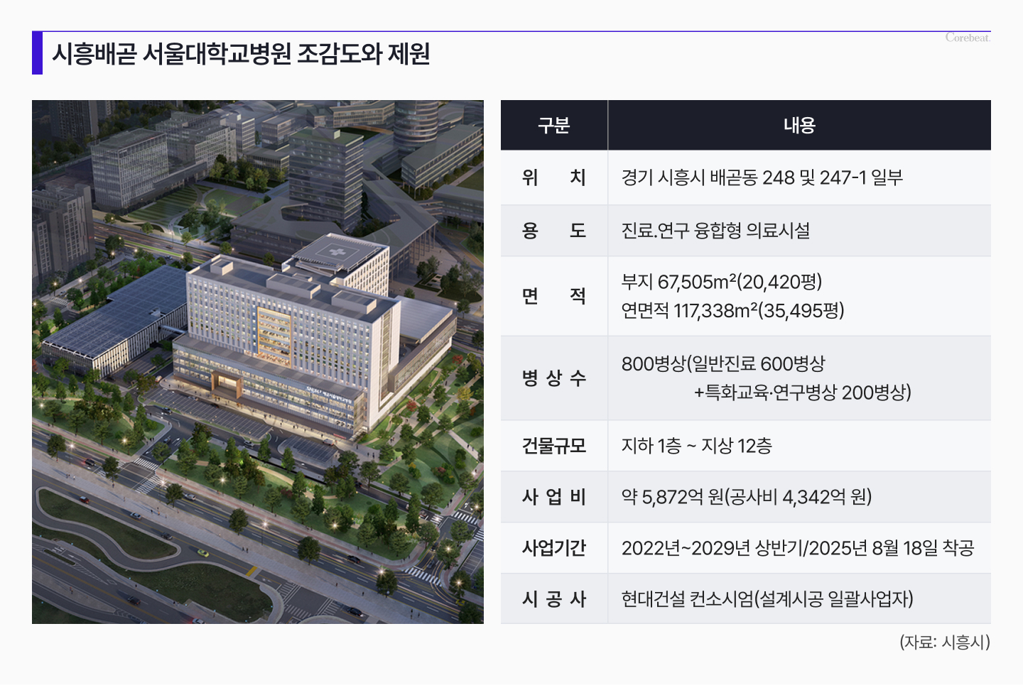 11일 시흥시와 관련 업계에 따르면 서울대병원은 경기 시흥시 배곧동 248·247-1 일대 6만7505㎡(약 2만420평) 부지에 들어선다. 연면적 11만7338㎡(3만5495평)에 지하 1층~지상 12층 규모로 800병상(일반 600, 특화 200)이 계획돼 있다. 사업은 2022년 공식 착수됐고, 지난 8월 18일 본공사를 시작했다. 2029년 완공이 목표다.