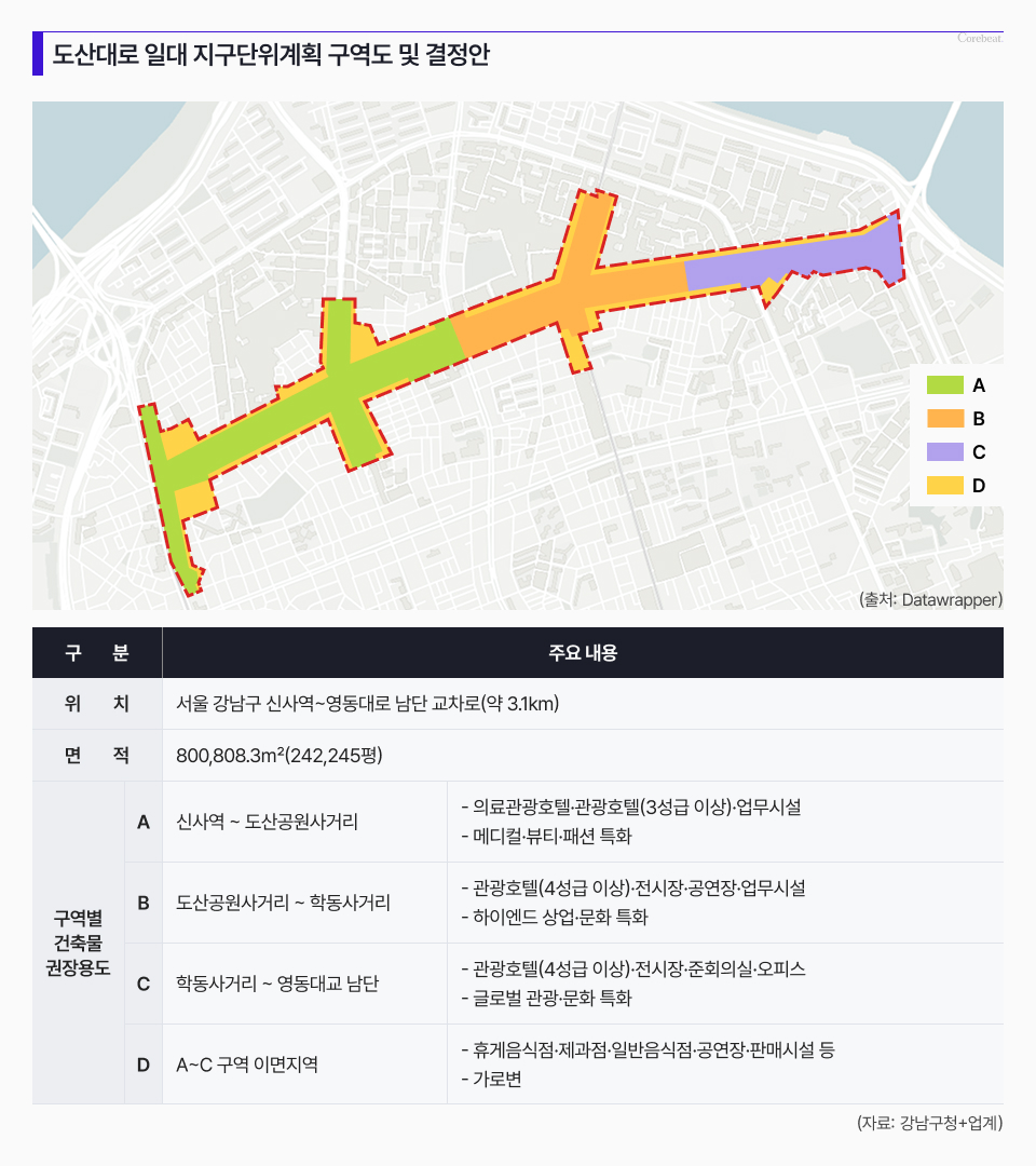 또 권역별 특화 전략도 마련됐다. △신사역~도산공원사거리 구간(A구역)은 의료관광호텔·메디컬·뷰티·패션 △도산공원사거리~학동사거리(B구역)는 하이엔드 상업·문화 △학동사거리~영동대교 남단(C구역)은 글로벌 관광·문화시설 밀집지역으로 육성한다. 이면지역(D구역)은 음식점·공연장·판매시설 등 가로 활성화를 통한 보행 네트워크 강화가 목표다.