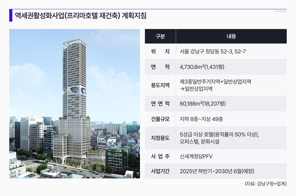 계획안의 상징적 사업은 청담동 프리마호텔 재건축이다. 신세계청담PFV가 주도하는 이 프로젝트는 부지 4731㎡(약 1431평), 연면적 6만188㎡(약 1만8207평), 지하 8층~지상 49층 규모의 초고층 복합건물로 개발된다. 전체 용적률의 절반 이상이 5성급 이상 호텔로 채워지고, 오피스텔과 문화시설이 함께 도입된다. 사업은 2030년 준공을 목표로 지난 7월부터 철거 공사가 진행 중이다.