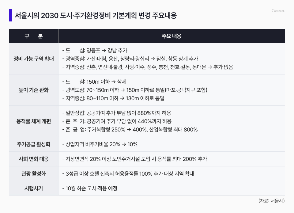 핵심 내용은 △정비가능구역 확대 △높이 기준 완화 △용적률 체계 개편 △의무 비주거비율 완화 △시니어주택·숙박인프라 공급 확대다.