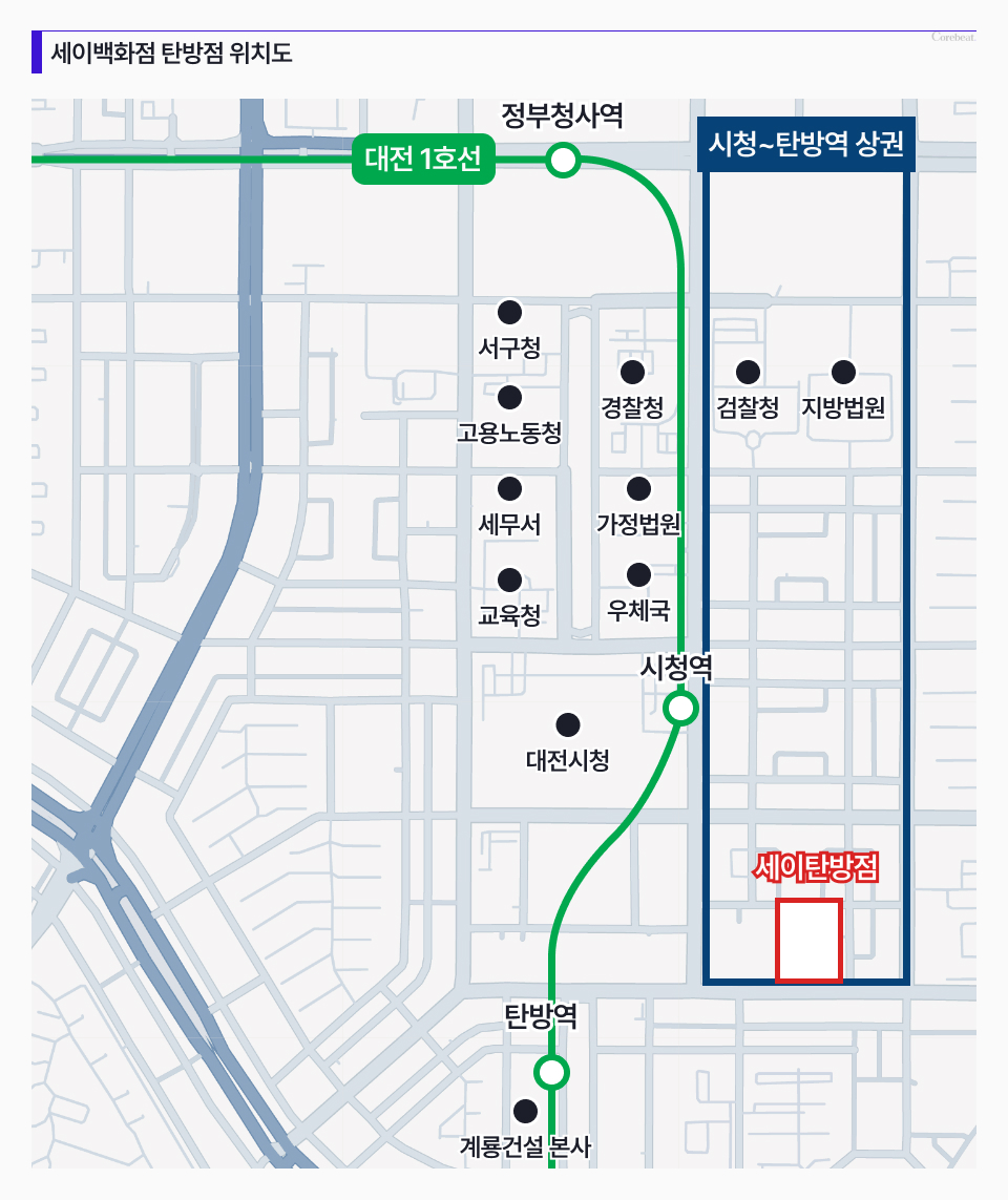 24일 부동산 업계와 온비드에 따르면, 계룡건설은 8월말 대전광역시 서구 탄방동 744에 위치한 ‘세이백화점 탄방점’을 공매를 통해 인수했다. 이 자산은 토지 3890㎡(약 1177평), 건물 2만 8501㎡(약 8622평) 규모다.