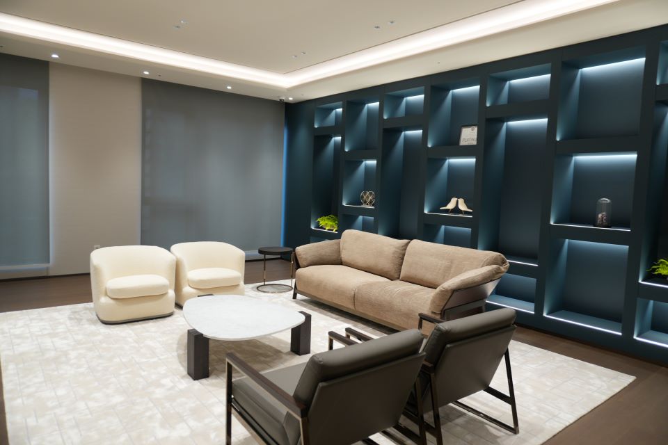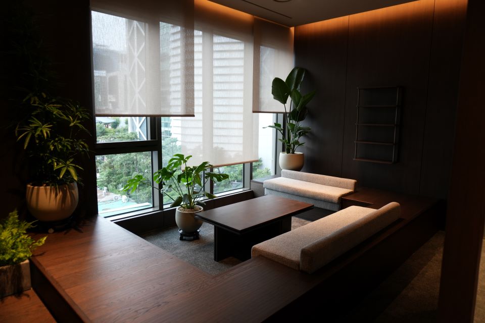 Step onto the third floor and the change is striking. The lobby lounge resembles a five-star hotel, layered with carefully curated artwork—including pieces by renowned Korean artist Lee Ufan—developed in collaboration with professional curators.