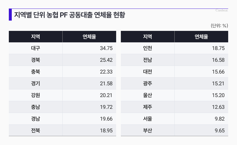 하지만 지난해부터 부동산 개발사업 시행사들이 토지매입 등을 위해 브릿지론 대출을 받았다가 본PF로 전환하지 못하고 대출을 연체하는 사례가 늘면서 단위 농협들의 공동대출도 빠른 속도로 부실화됐다.