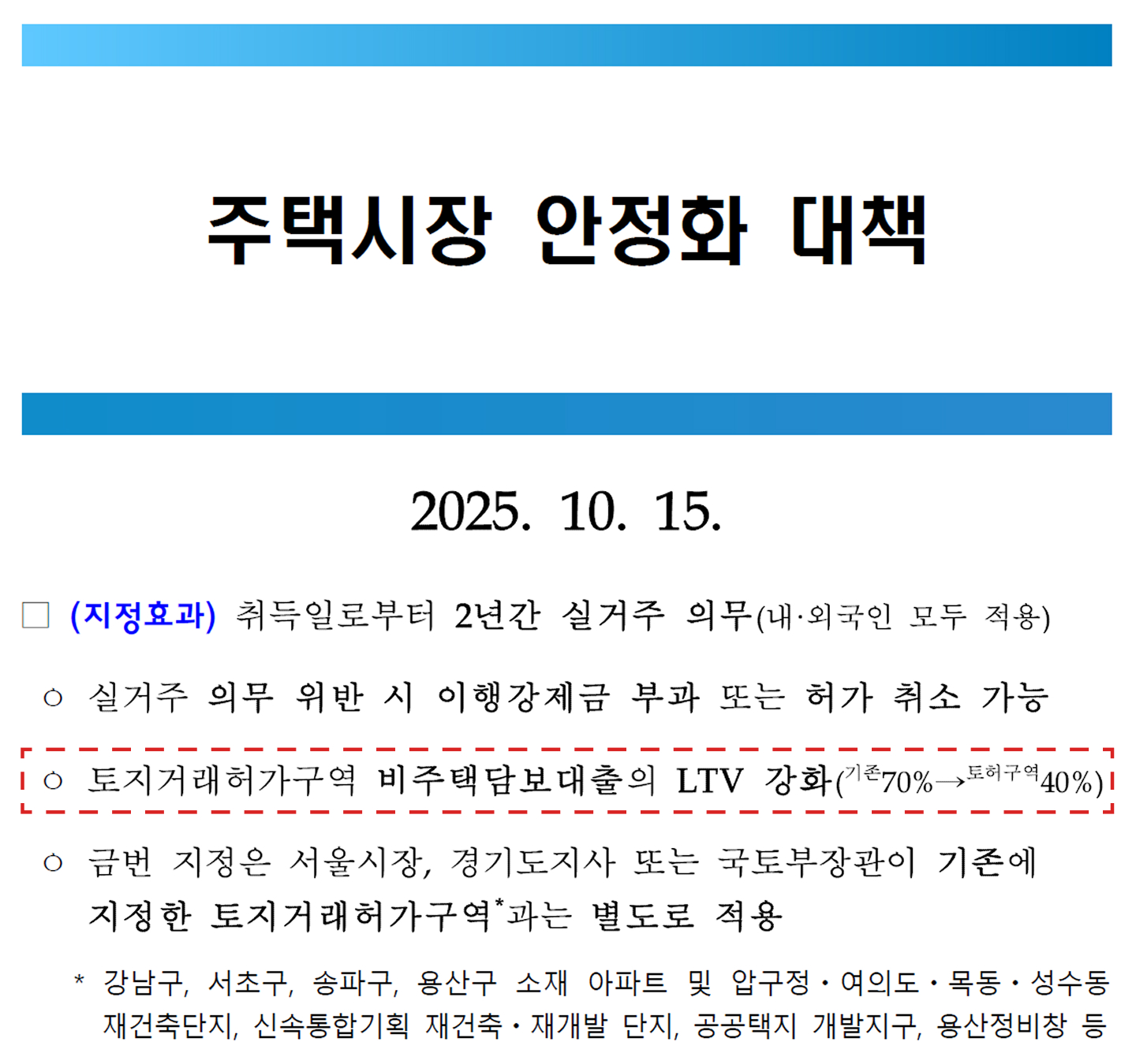 그러나 국토부는 17일 배포한 '10.15 주택시장 안정화 대책 관련 FAQ'를 통해 "이번에 새로 지정된 토허구역(서울 전역 및 경기 12곳)은 아파트 등 주택에만 효력이 있다"며, 비주택 LTV 40% 규정은 적용되지 않는다고 해명했다. 이에 따라 새로 지정된 허가구역 내 오피스텔·상가·꼬마빌딩 등은 기존대로 LTV 70%가 유지된다.