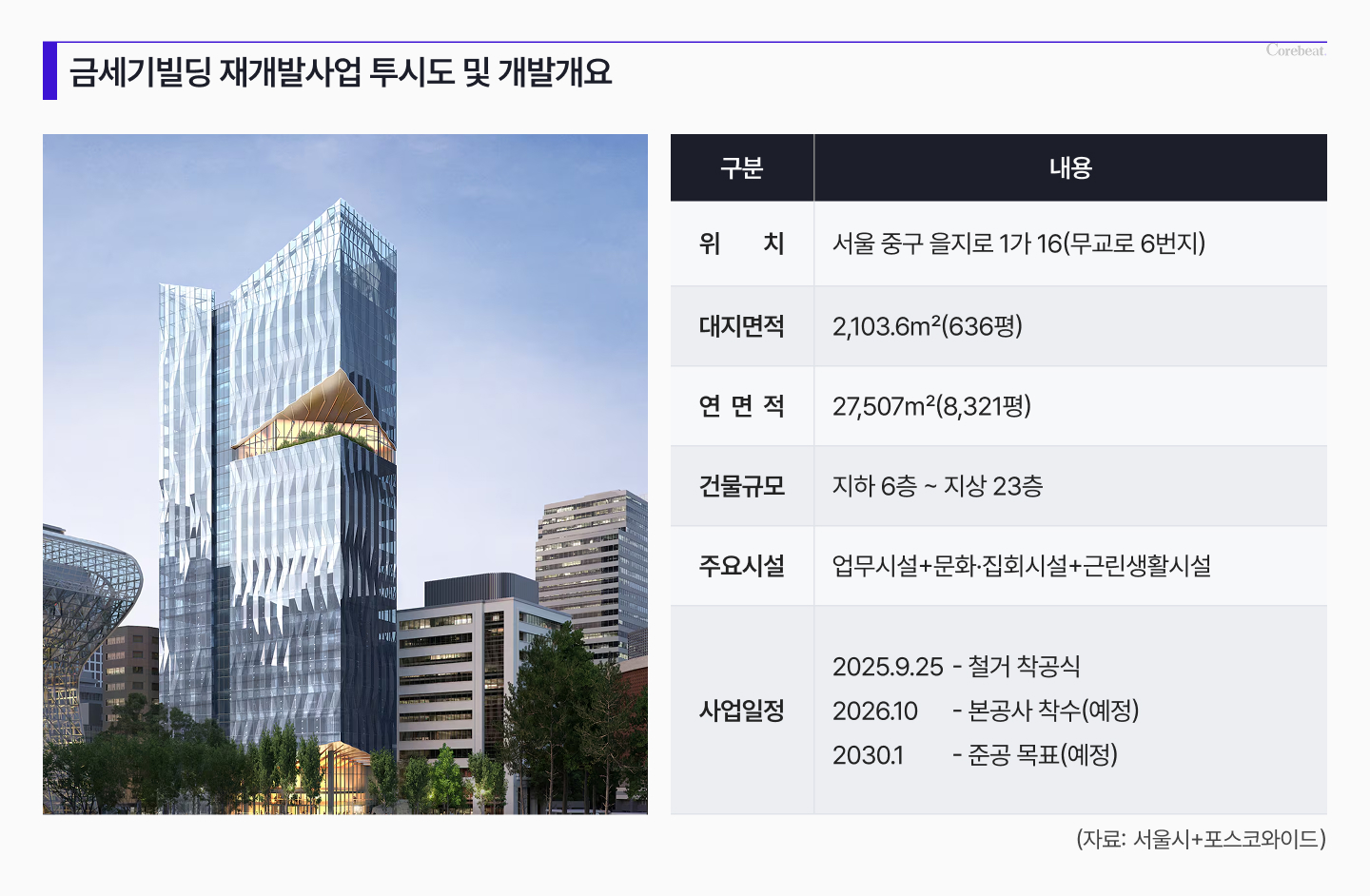 사업지는 지하철 1·2호선 환승역인 시청역과 지하철 2호선 을지로입구역 사이 2103.6㎡(약 636평) 부지다. 기존 13층 오피스 건물을 지하 6층~지상 23층, 연면적 2만7507㎡(약 8300평) 규모의 복합업무시설로 개발한다. 본공사는 내년 10월 시작되며, 준공 목표는 2030년 1월이다. 추정 총사업비는 2800억 원(2024년 8월 정비계획 변경 결정 고시 기준)이다.