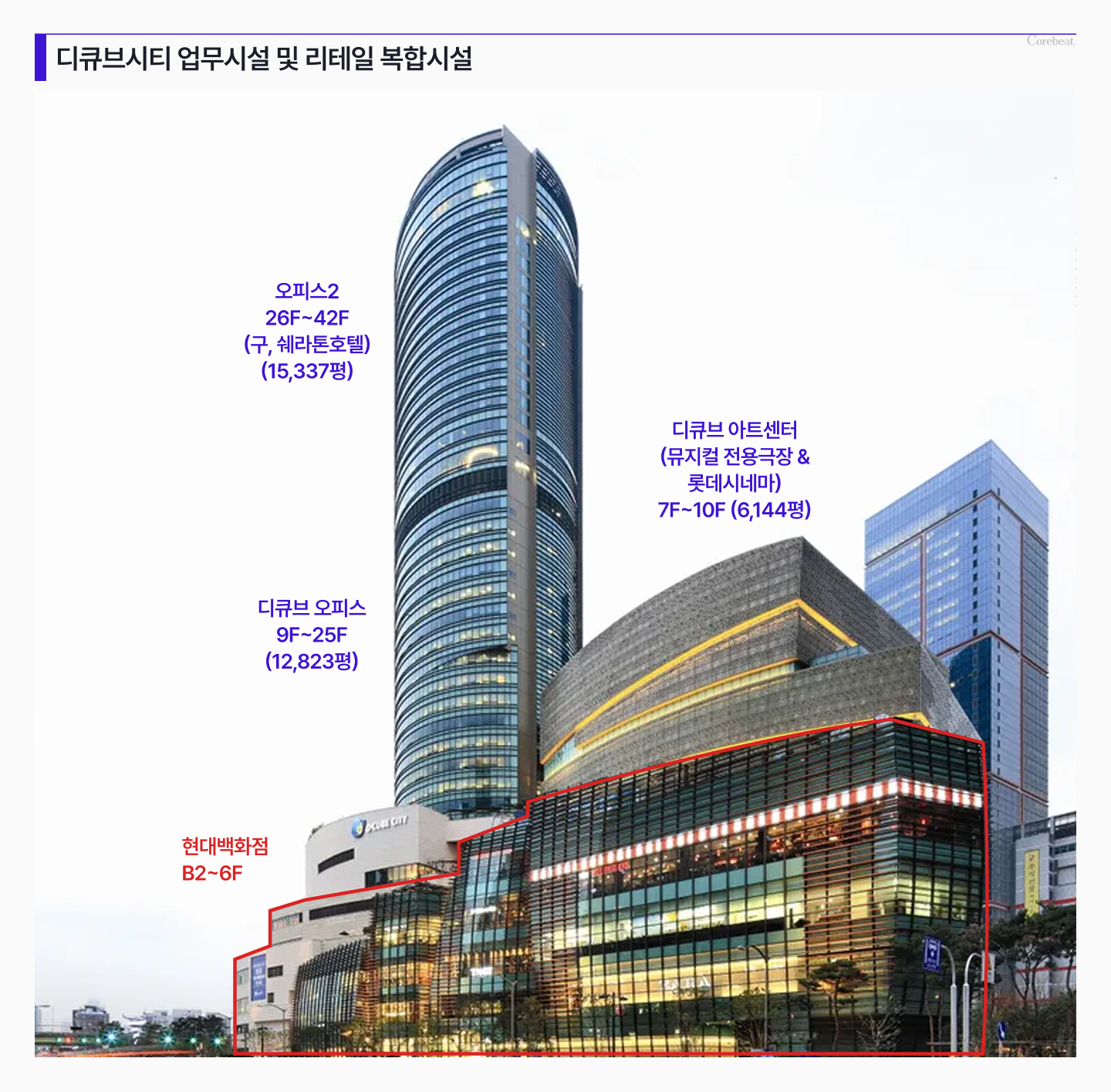 서울 구로구 신도림동 692번지 일원에 위치한 디큐브시티는 오피스 2개동과 상업시설로 구성돼 있는 복합시설이다. 오피스 2개동은 케펠자산운용이 보유하고 있으며, 지하 2층~지상 6층, 연면적 11만6587m² 규모의 현대백화점 디큐브시티점은 이지스자산운용이 2022년 6월 인수했다.