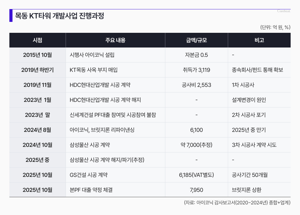 아이코닉의 목동 개발사업으로 알려진 이 프로젝트는 2019년 KT타워 부지를 확보한 이후 네 차례의 중대한 고비를 거쳐야 했다. 그 과정은 국내 부동산 개발시장의 복잡한 자금 구조와 시공 리스크를 압축적으로 보여준다.