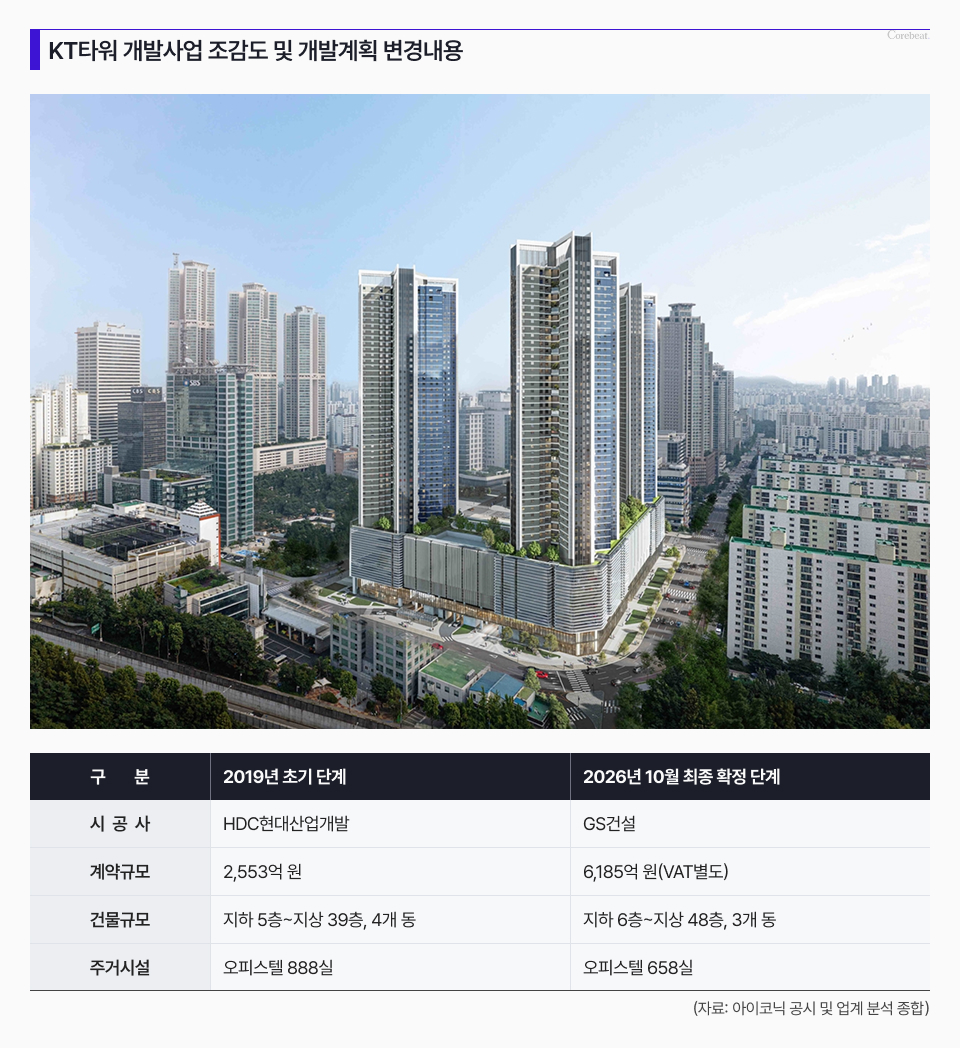 당초 계약은 총 2553억 원 규모로, 지하 5층~지상 39층 높이의 오피스텔 4개 동, 888실을 짓는 내용이었다. 그러나 최종 확정된 계획에서는 시공사가 GS건설로 바뀌고, 총 공사금액이 6185억 원(VAT 별도)으로 두 배 이상 늘었다. 건물은 지하 6층~지상 48층, 3개 동으로 상향됐으며, 주거시설은 658실 규모의 오피스텔로 조정됐다.