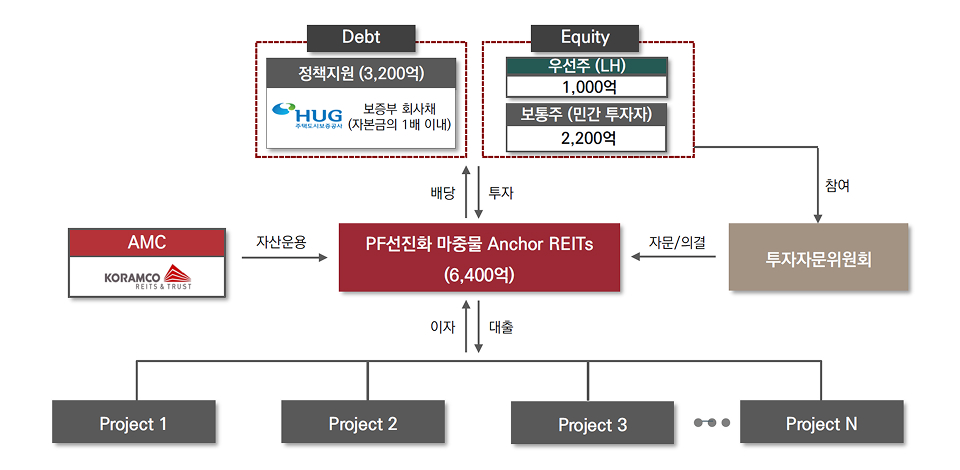 PF 선진화 마중물 개발앵커리츠는 LH와 민간이 출자해 조성된 리츠가 브릿지론 단계의 사업장에 투자한 뒤 본PF 전환 때 자금을 회수하는 제도다.