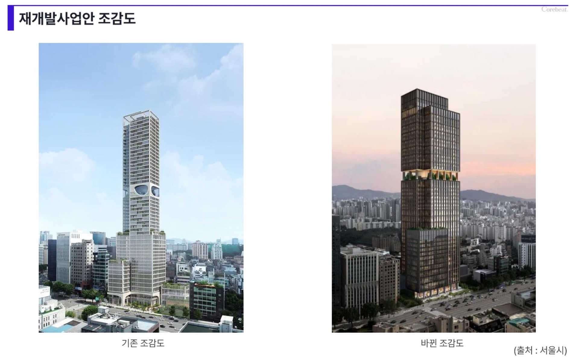 층수 변화에 맞춰 건물 외관에도 큰 변화가 있다. 종전 투시도가 밝은 톤의 단일 건물 형태에 가까웠다면, 새 투시도는 상·중·하부가 명확히 구분된 모습이다.