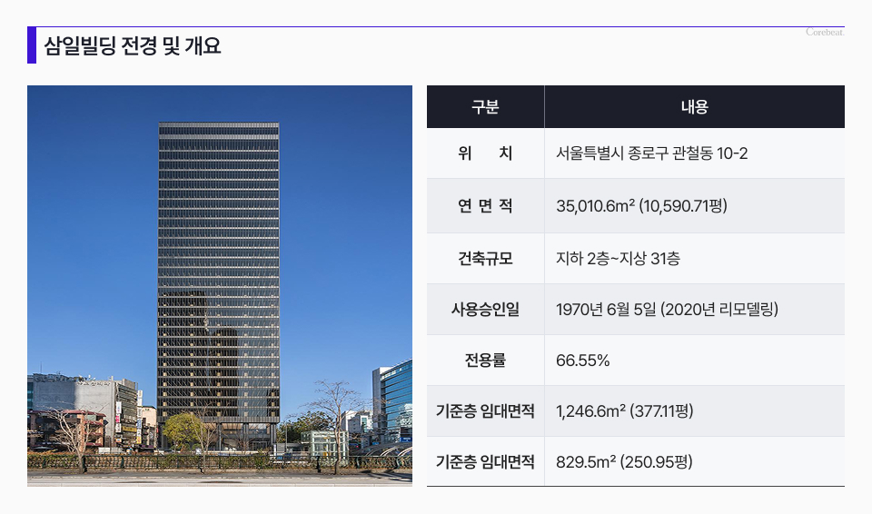 종로구 관철동에 위치한 삼일빌딩은 지하 2층~지상 31층, 연면적 3만5010m²(약 1만590평) 규모로, 전용률은 66% 수준이다.