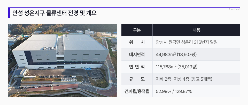경기 안성시 원곡면 성은리 316번지에 위치한 성은지구 물류센터는 4만4983m²(약 1만3607평) 부지에 지하 2층~지상 4층(창고 5개층), 연면적 11만5768m²(약 3만5019평) 규모다. 지하 2층은 저온, 지하 1층 및 지상 1·3·4층 상온 창고로, 저온 10%의 혼합 물류센터다.