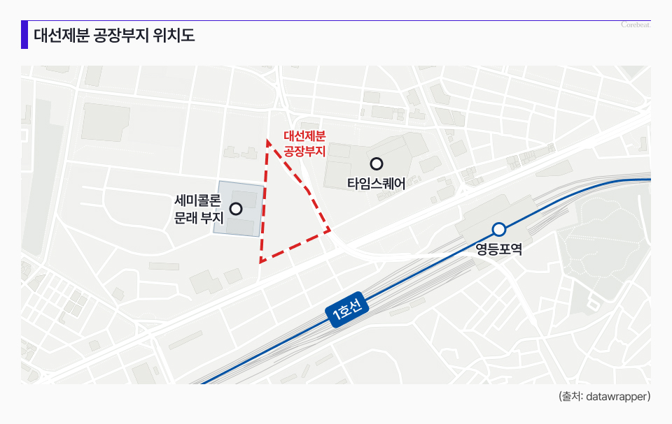 서울 영등포구 문래동 3가에 위치한 대선제분 영등포 공장 부지는 대선제분이 2013년 공장을 충남 아산으로 이전한 뒤 12년 동안 방치돼 왔다. 그러다 서울시가 2020년 대선제분 공장과 주변 낙후 지역을 재개발하기 위해 ‘영등포 대선제분 도시정비형 재개발구역’으로 지정했다. 대선제분 공장 부지는 1구역 4지구다.