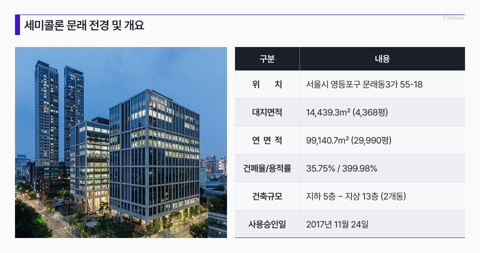 인접한 세미콜론 문래가 1만4439m²(약 4368평) 대지에 399.98%의 용적률, 35.75%의 건폐율을 적용받아 연면적 9만9140.74m²(약 2만9990평) 규모다.