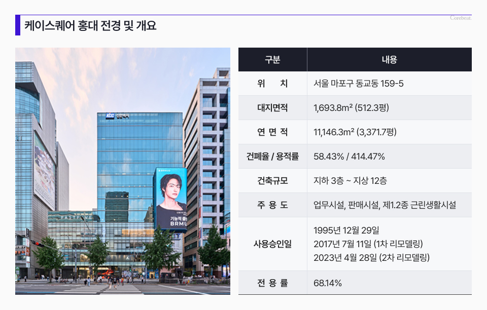 오피스와 리테일이 결합된 이 자산은 대형 쇼핑몰 타임 스퀘어(Time Square)를 운영하는 ㈜경방이 주요 임차인 및 보통주 투자자로 참여하고 있다. 코람코신탁은 K-컬쳐 열풍으로 홍대 인근 외국인 관광객 수요가 크게 늘었으며, 용도 변경을 통한 메디컬(의료 시설) 또는 호텔 전환 여력을 강점으로 내세우고 있다.