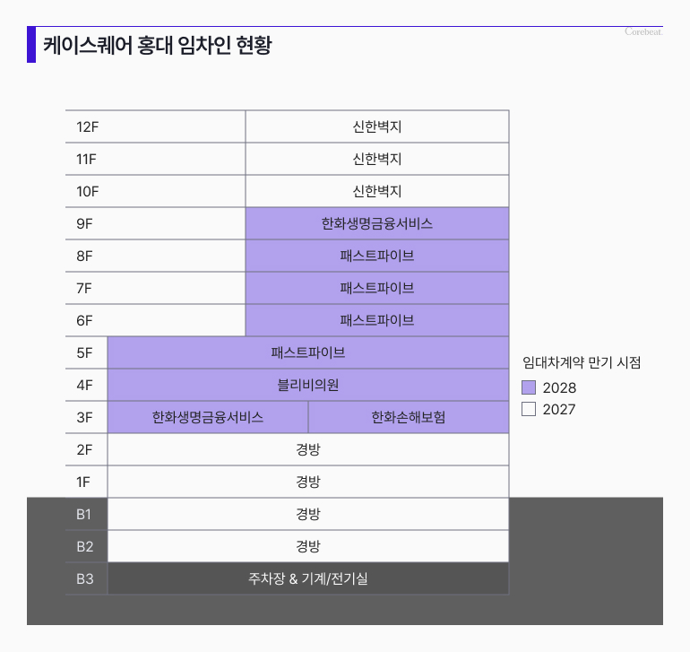 코람코신탁과 매각 자문사가 배포한 티저에 따르면, 케이스퀘어홍대는 공실이 전혀 없으며 잔여 임대차기간(WALE)2.3년이다. 리테일 운영사인 ㈜경방과 신한벽지, 패스트 파이브(공유 오피스 기업), 한화손해보험 등이 주요 임차인이다.