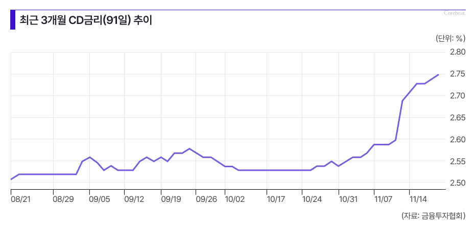 21일 금융투자협회에 따르면 CD금리(91일)는 전날 2.76%로, 한 달 전보다 20bp가량 뛰었다. CP(91일) 역시 같은 기간 엇비슷하게 급등했다.