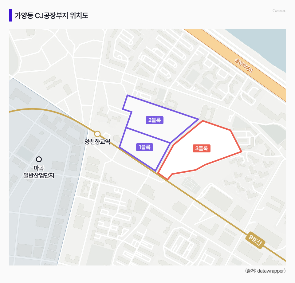 총 사업비 6조 원 규모의 가양동 CJ공장 부지 개발 사업은 가양동 100-1번지 일대 약 2만8340평 규모에 지하 7층~지상 14층, 연면적 23만1000평 규모의 지식산업센터와 오피스 등을 건설하는 프로젝트다. 이 가운데 3블록은 연면적이 10만7500평으로 가장 넓으며, 지산으로 계획된 부지는 약 9만 평에 달한다.