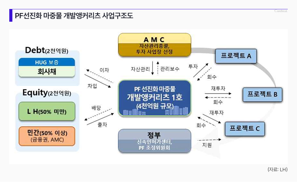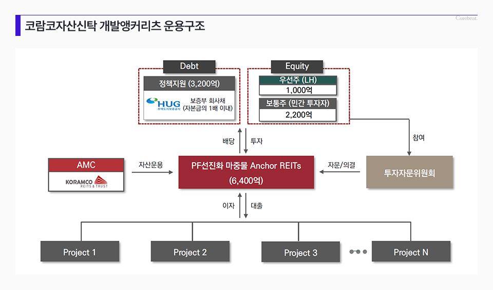 우선 LH는 코람코와 한토신에 각각 1000억 원씩 출자하게 된다. 코람코와 한토신은 LH 출자금액을 초과하는 규모의 민간 투자자를 유치할 예정이다. 여기에 HUG 보증부 회사채를 발행해 에쿼티의 100% 이내에서 대출을 조달해 투자 자금을 활용한다.
