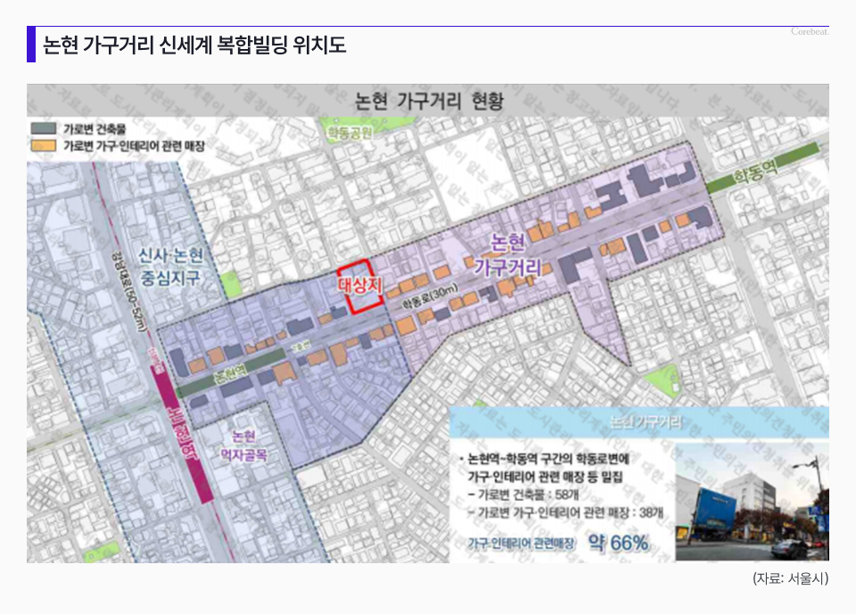 대상지는 7호선 논현역과 학동역 사이 약 800m 구간의 학동로변으로, 건축물 10곳 중 6곳 이상이 가구·인테리어 매장인 국내 대표 특화 상권이다. 대부분 4층 이하 저층부에 쇼윈도 형태로 운영되는 보행 중심의 가로 상권이 특징이다.