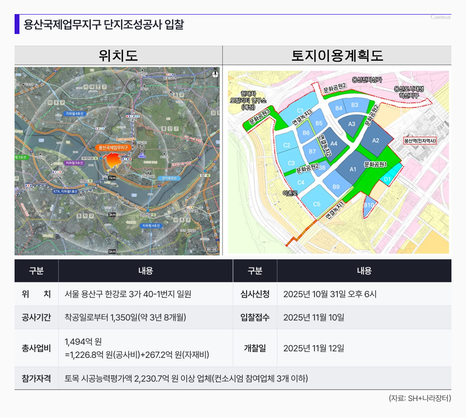 24일 나라장터에 따르면 서울주택도시개발공사(SH)가 발주한 '용산국제업무지구 도시개발사업 단지조성공사'의 시공사로 대보건설 컨소시엄이 선정되어 26일 정식 계약을 체결한다.