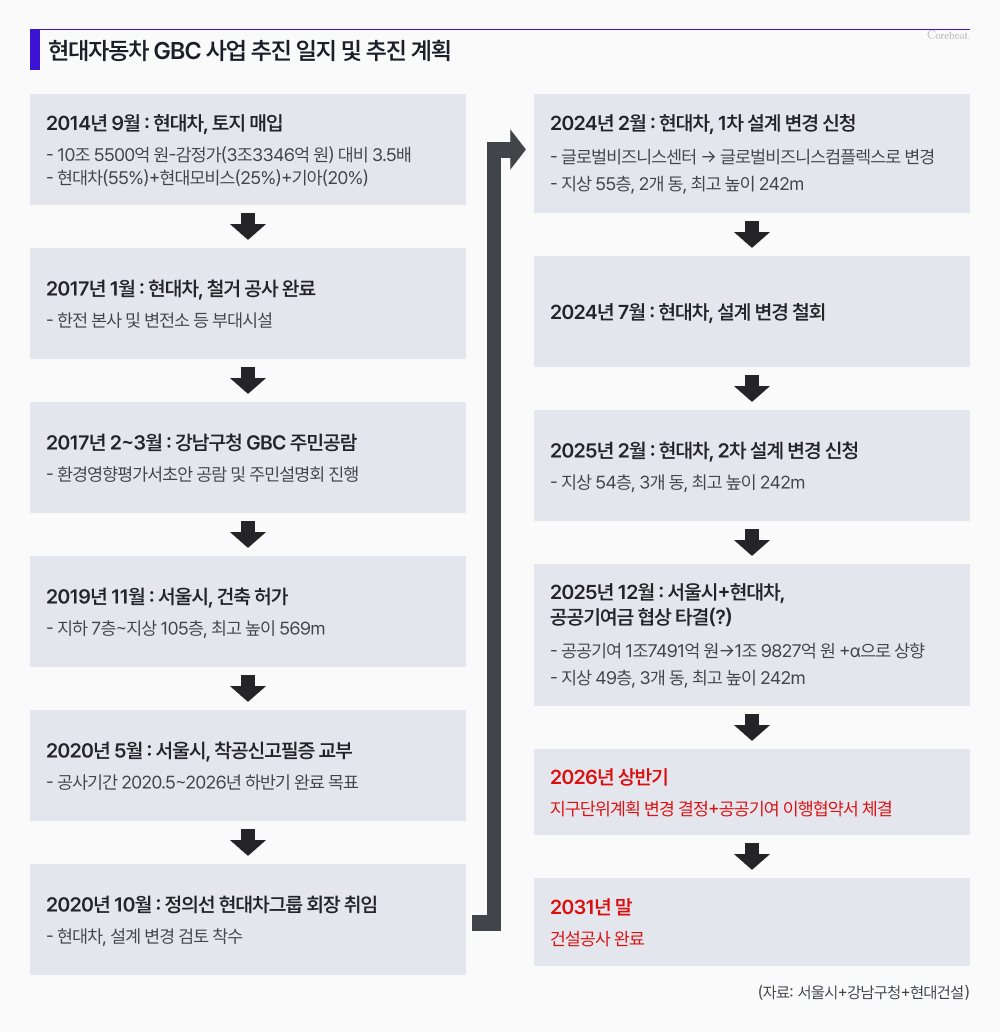 서울시는 현대자동차그룹의 변경 제안을 반영한 추가 협상을 지난해 12월 30일 완료하고, 이를 토대로 개발계획의 밑그림을 확정했다고 6일 밝혔다. 이로써 2014년 부지 매입 이후 약 12년, 2020년 착공 이후 약 6년 간 표류했던 GBC 사업은 2031년 준공을 향해 다시 속도를 내게 됐다.