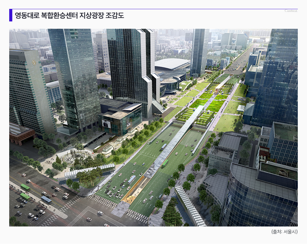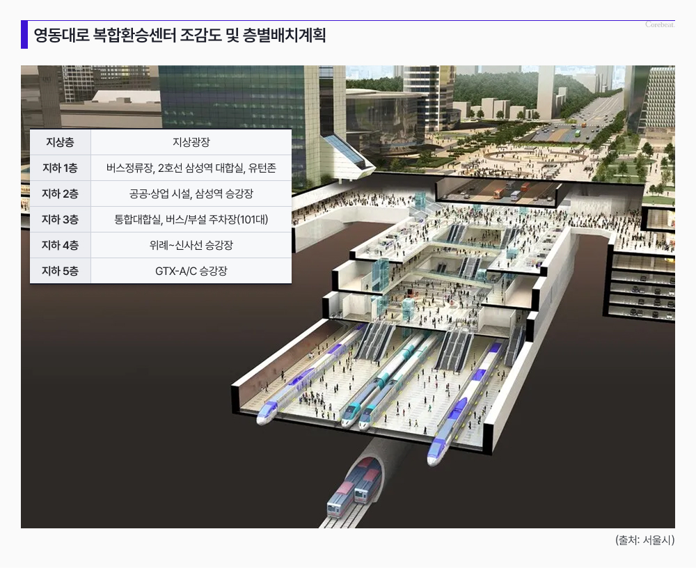 특히 핵심은 ‘지하 광역 교통 네트워크’ 구축이다. 5개 철도 노선(GTX-A·C, 도시철도 2·9호선 및 위례신사선)이 교차하는 ‘영동대로 지하 복합환승센터’를 매개로, 지상 마천루들이 지하에서 하나의 동선망으로 묶이는 구조다.