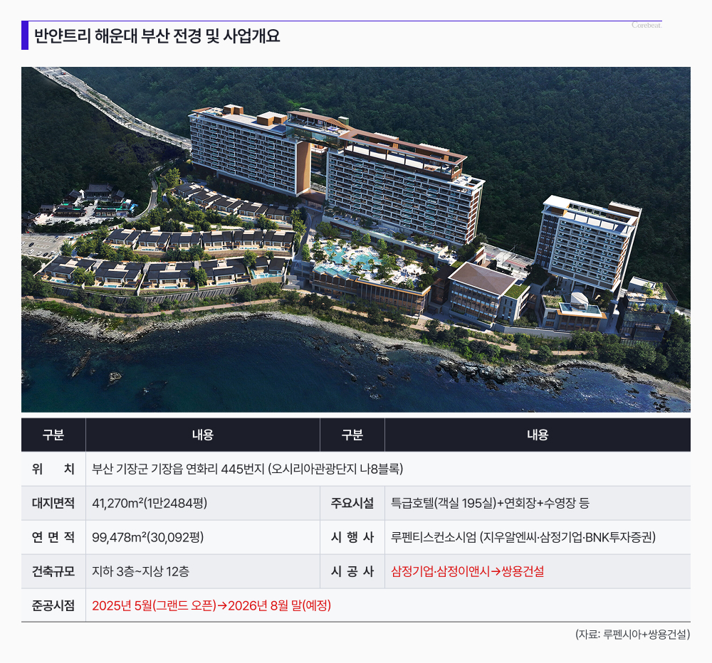 화재 사고로 1년 가까이 멈춰 섰던 부산 기장군 오시리아 관광단지 내 최고급 숙박시설 ‘반얀트리 해운대 부산’(반얀트리 해운대)의 개발사업이 마침내 재개될 전망이다. 기존 시공사의 회생절차 돌입과 대주단 역할 재편이라는 진통 속에서 1군 건설사 쌍용건설이 ‘구원투수’로 투입됐다.