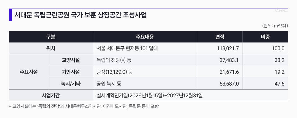 서대문구 고시에 포함된 독립근린공원 조성계획에 따르면 공원은 △교양시설 3만7483(33.2%) △기반시설 2만1671㎡(광장 포함·19.2%) △녹지 및 기타 5만3687㎡(47.6%)로 구성된다. 특히 그동안 단절돼 있던 독립문~서대문형무소역사관 동선이 하나의 ‘보훈 클러스터’로 통합되며 대규모 광장(1만3129㎡)이 조성된다.