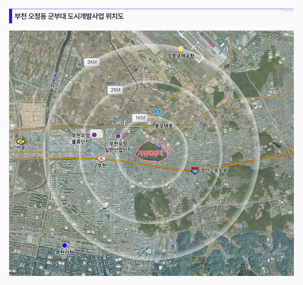 부천 오정동 군부대 도시개발사업은 오정동 148번지 일원 44만5311m² 부지에 4000세대 규모의 공동주택과 대규모 공원, 생태하천을 조성하는 사업이다. 김포공항으로부터 불과 3km 떨어진 입지와 미니신도시 급 규모로 2019년 부천시 발표 당시부터 주목을 받아왔다.
