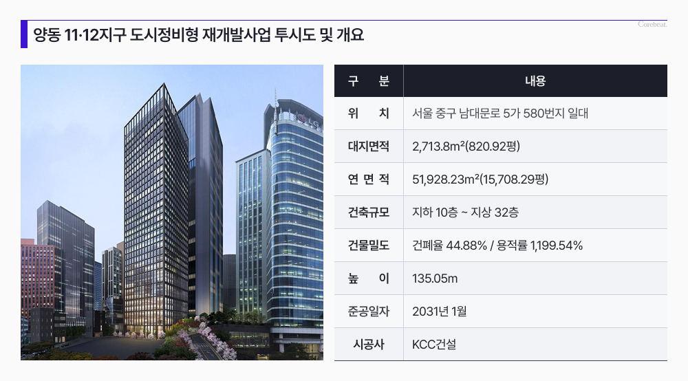 양동 11·12지구 재개발 사업은 중구 남대문로5가 580번지 일원 2713.8m²(약 820평) 부지에 연면적 5만1928m²(약 1만5708평), 지하 10층~지상 32층 규모의 오피스 빌딩 ‘더 스페이스 양동’을 짓는 사업이다.