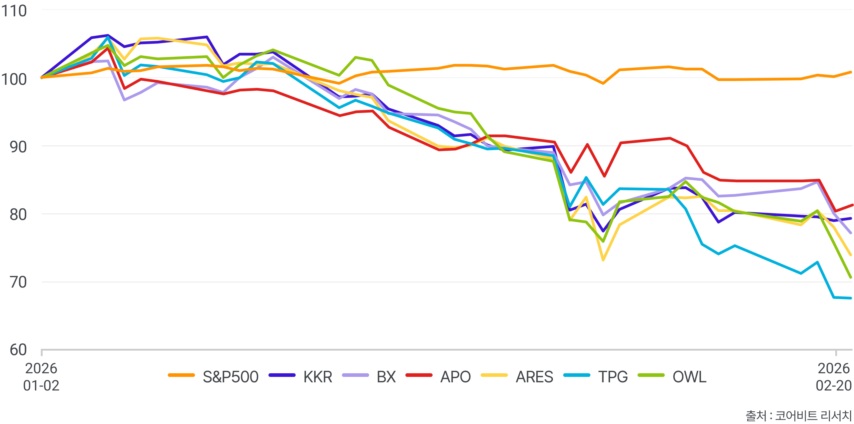 대규모 사모자본을 운용하는 글로벌 대체투자 운용사들의 주가가 시장 대비 크게 흔들리고 있는 것이다. Ares, Apollo, KKR 등 Private Credit 시장을 이끌어 온 운용사들의 주가는 연초 이후 뚝 떨어졌다. 개별 운용사의 실적이나 특정 투자 실패로 설명하기에는 비슷한 움직임이 여러 운용사에서 동시에 나타나고 있다는 점이 주목된다.