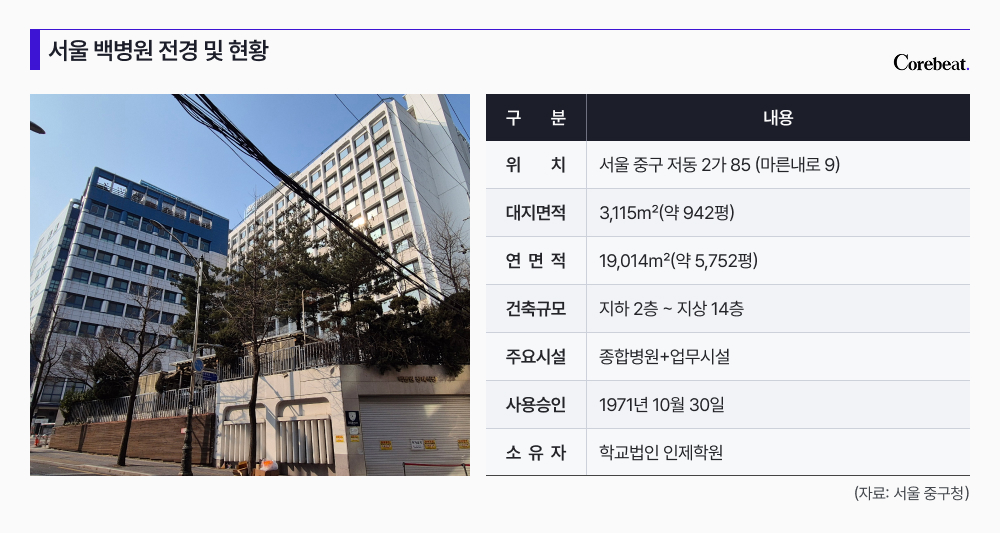 인제학원은 1978년 이 부지를 증여받아 병원을 운영해 왔으며, 토지와 건물 등기부상 근저당권 등 별도 담보권 설정이 없는 ‘클린 자산’으로서 매각 시 권리 정리 부담이 적다. 기존 건축물은 1971년 사용승인을 받은 이후 50년이 훌쩍 넘은 노후 건물로, 사업성을 고려할 때 전면 철거 후 신축될 가능성이 높다.