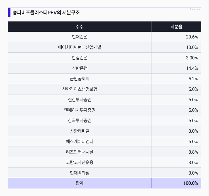 복정역세권 복합개발 프로젝트를 추진하고 있는 현대건설 컨소시엄이 설립한 송파비즈클러스터PFV는 14곳이 주주로 참여했다. 29.6%의 지분을 가진 현대건설이 최대주주이고, 신한은행(14.4%), 신한라이프생명보험(5.0%), 신한투자증권(5.0%), 신한캐피탈(3.0%) 등 신한금융그룹이 27.4%의 2대 주주다. 현대건설이 사업을 이끌어가고, 신한이 돈을 대는 구조다.