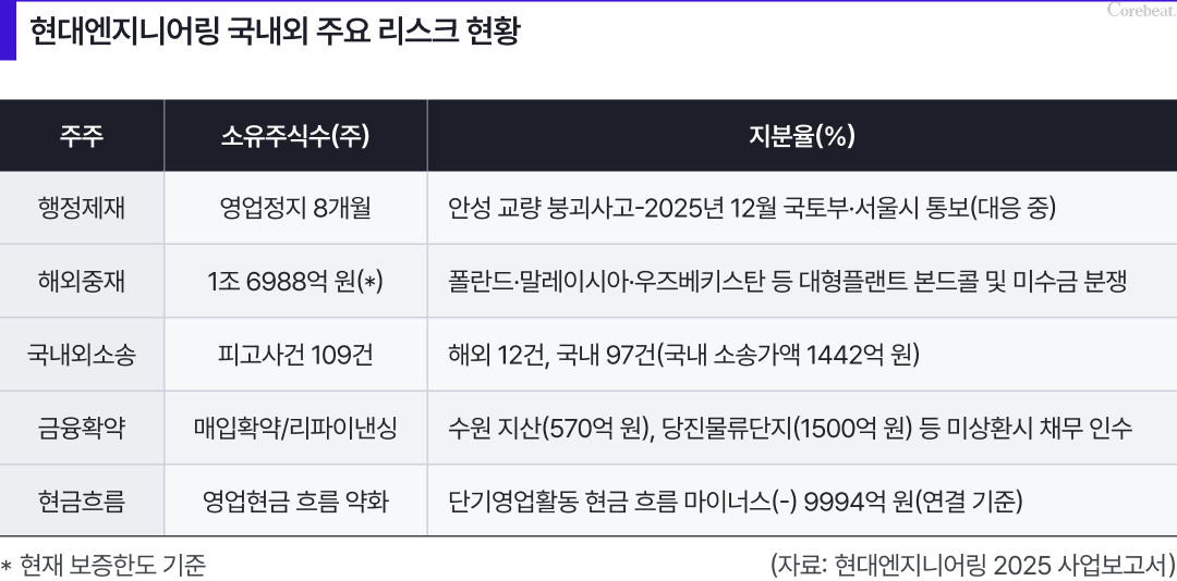 국내 리스크도 적지 않다. 하자소송과 수분양자 계약 해제, 하도급대금 청구가 누적된 가운데, 안성 서울-세종고속도로 9공구 교량 붕괴 사고의 여파로 지난 2025년 12월 국토교통부와 서울시가 각각 영업정지 8개월 사전통지를 내렸다.