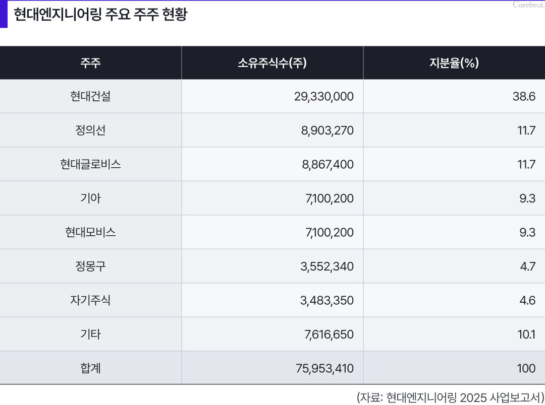주주구조 역시 시장이 주목하는 대목이다. 현대엔지니어링은 최대주주인 현대건설(38.62%)을 중심으로, 정의선 회장(11.72%)과 현대글로비스·기아·현대모비스 등 그룹 계열사가 지분 85% 이상을 보유하고 있다. 이 같은 지배구조를 감안하면 현대엔지니어링은 단순 건설사를 넘어 그룹 내 핵심 계열사 하나로 평가된다.