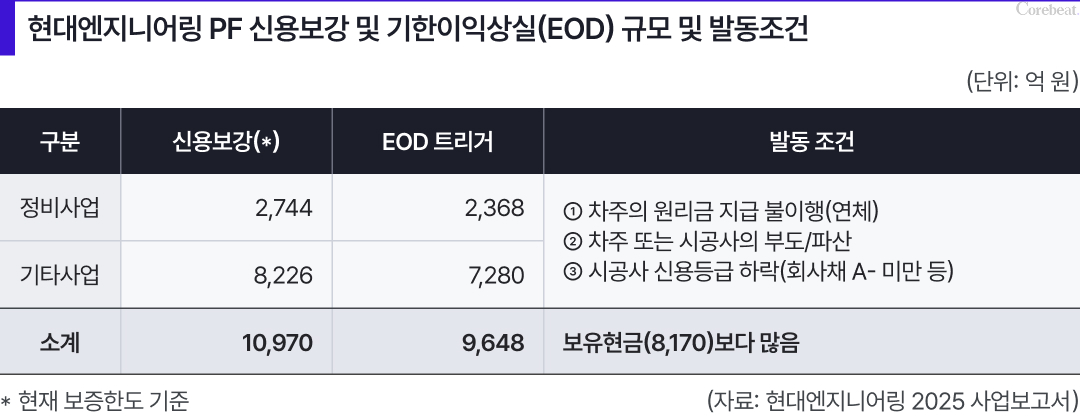 정비사업 PF의 경우 “시공사의 회사채 신용등급이 A- 이하 또는 기업어음 등급이 A2- 이하로 하락할 경우”에 EOD 사유가 발생하는데, 이 금액이 2368억 원이다. 기타사업 PF에서도 똑같은 조건이 설정돼 있고, 그 규모는 무려 7280억 원에 달한다. 결국 단순 PF 보증 리스크를 넘어 신용등급 변동이 발생할 경우 9648억 원, 약 1조 원에 육박하는 유동성 부담이 단기간에 현실화할 수 있는 구조다.